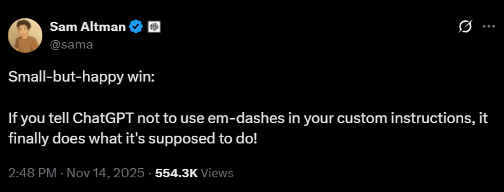 A small moment from this week shows it clearly. Sam Altman posted a lighthearted update celebrating that ChatGPT finally follows a “no em dash” instruction. Funny, yes, but also telling. For all the grand claims about AI reshaping civilisation, a lot of the real work is still tiny corrections and simple preferences. The myth gets bigger and glossier, while the reality stays very ordinary. That’s not a failure. It’s a reminder that AI’s a tool, not the all-knowing oracle the kings and gods like to imagine.